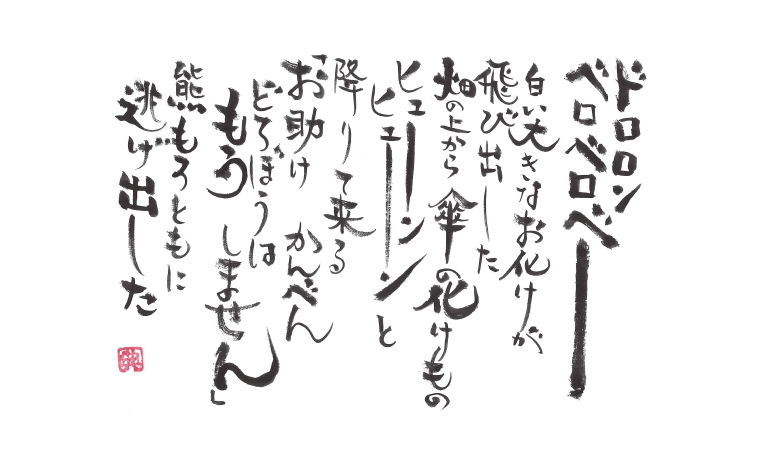 ドロロン ベロベロベー 白い大きなお化けが飛び出した 畑の上から傘の化けもの ヒューンヒューンと 降りて来る 「お助け かんべん どろぼうは もう しません」 熊もろともに 逃げ出した